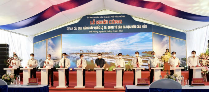 Các đại biểu thực hiện nghi lễ nhấn nút khởi công Dự án cải tạo, nâng cấp Quốc lộ 10, đoạn từ cầu Đá Bạc đến cầu Kiền
