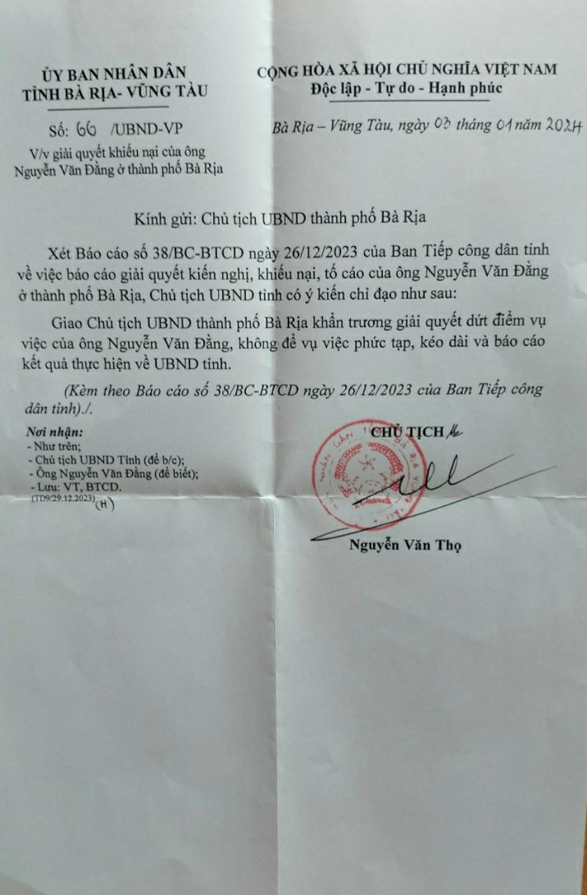 Nội dung công văn nêu rõ: “Xét báo cáo số 38/BC-BTCD ngày 26/12/2023 của Ban Tiếp công dân tỉnh về việc báo cáo giải quyết kiến nghị, khiếu nại, tố cáo của ông Nguyễn Văn Đằng ở TP Bà Rịa, Chủ tịch UBND tỉnh có ý kiến chỉ đạo như sau: giao Chủ tịch UBND thành phố Bà Rịa khẩn trương giải quyết dứt điểm vụ việc của ông Nguyễn Văn Đằng, không để vụ việc phức tạp kéo dài và báo cáo kết quả thực hiện về UBND tỉnh ( kèm theo Báo cáo số 38/BC-BTCD ngày 26/12/2023 của Ban Tiếp công dân tỉnh”- trích công văn số 66/UBND tỉnh BRVT.