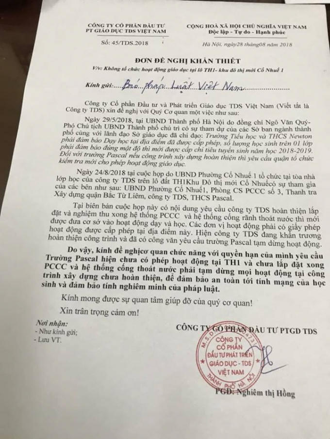 Báo Pháp luật Việt Nam nhận được đơn kêu cứu khẩn cấp của bà Nghiêm Thị Hồng, Phó giám đốc Công ty cổ phần đầu tư PT giáo dục TDS Việt Nam, (viết tắt là Công ty TDS) phản ánh về việc Trường tiểu học và Trung học cơ sở Pascal có địa chỉ tại khu đô thị mới Nam Cường thuộc phường Cổ Nhuế 1, quận Bắc Từ Liêm TP Hà Nội ngang nhiên tổ chức tuyển sinh, giảng dạy khi chưa được cấp phép hoạt động tại khu đất TH1 và chưa lắp đặt xong hệ thống PCCC, hệ thống thoát nước.