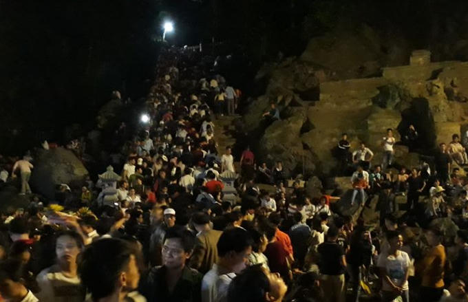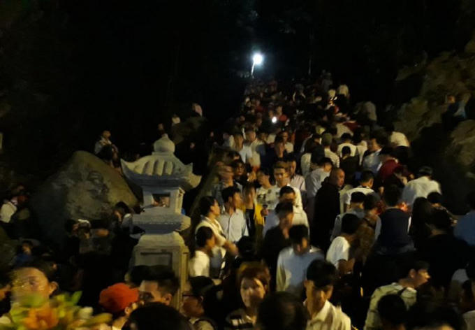 Đường lên động Hương Tích khá khó khăn, nhiều đoạn không có đèn điện nhưng vẫn không ngăn được dòng người mỗi lúc một đông.