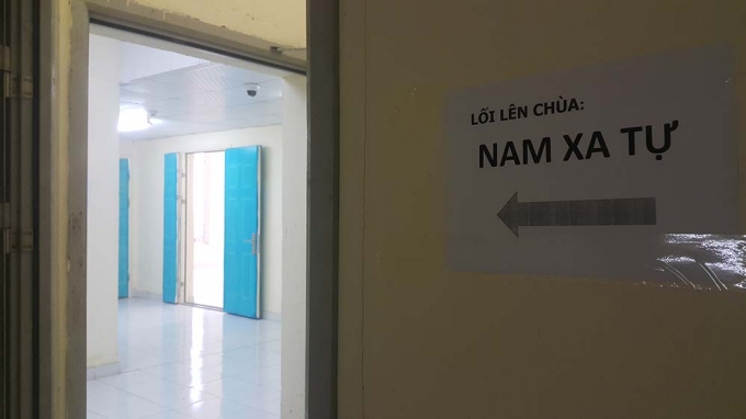 Muốn lên được ngôi chùa phải đi vào khu thang máy của tòa nhà. Vừa bước vào khu chờ thang máy thì đập ngay vào mắt là một tờ giấy dán trên tường, thông báo việc “cúng dâng sao giải hạn” tại tầng mái của tòa nhà CT2, dành cho cho các hộ gia đình tại tòa nhà CT1 và CT2 chung cư Nam Xa La.