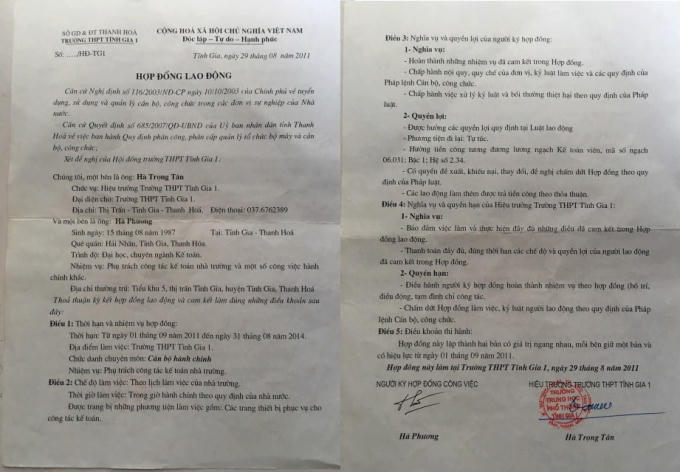 Để xác minh nguồn tin được chính xác, phóng viên yêu cầu bạn đọc cung cấp chứng cứ kèm theo đơn phản ánh. Cụ thể, hợp đồng lao động (không có số) ngày 29/8/2011, ghi rõ anh Hà Phương (SN 15/8/1987, trình độ đại học, chuyên nghành kế toán). Bản hợp đồng này do ông Hà Trọng Tân ký.