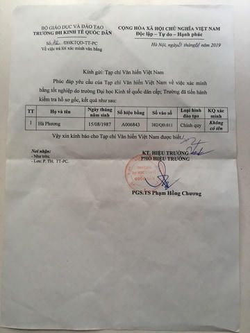 Lý lịch tự thuật của anh Hà Phương ghi rất rõ là sinh viên đại học Kinh Tế Quốc Dân. Anh Nguyên cũng xác minh được rằng ông Hà Trọng Tân đã dựa trên hồ sơ này và đã ký hợp đồng lao động cho con trai là anh Hà Phương vào làm kế toán tại trường, thời gian 03 năm, từ ngày 1/9/2011đến 31/8/2014. Trong công văn trả lời việc xác minh bằng văn bản của trường Đại học Kinh Tế quốc dân cũng nêu rõ: "không có người tên Hà Phương (sinh ngày 15/8/1987 số hiệu bằng A006843, số vào sổ 382/QĐ.011), công văn trả lời này do Phó giáo sư - Tiến sĩ Phạm Hồng Chương ký.