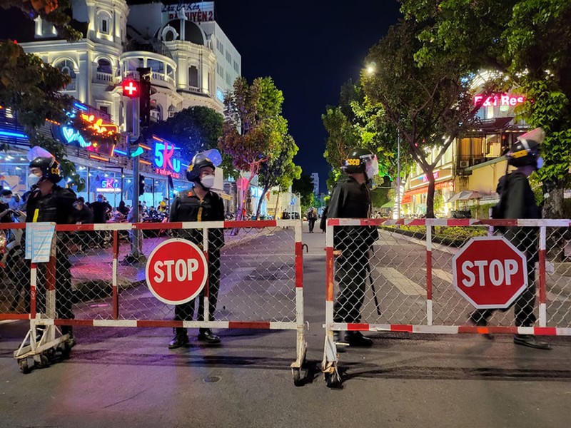Barie tại giao lộ Điện Biên Phủ - Nguyễn Thông được nhiều cảnh sát túc trực ngăn không cho người dân ra vào khu vực.
