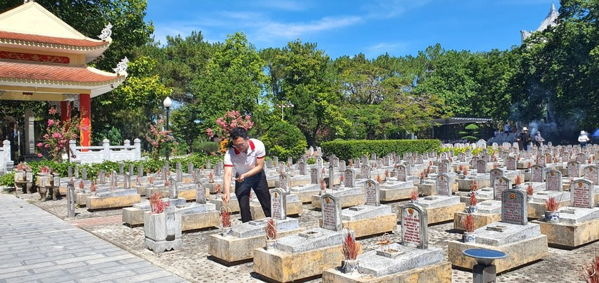 Nhà báo Trần Ngọc Hà - Phó Tổng biên tập Báo Pháp luật Việt Nam dâng hương các phần mộ liệt sĩ.