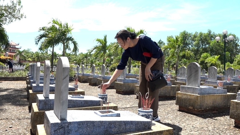 Nhà báo Vũ Hồng Thúy - Phó Tổng biên tập Báo Pháp luật Việt Nam dâng hương các phần mộ liệt sĩ.