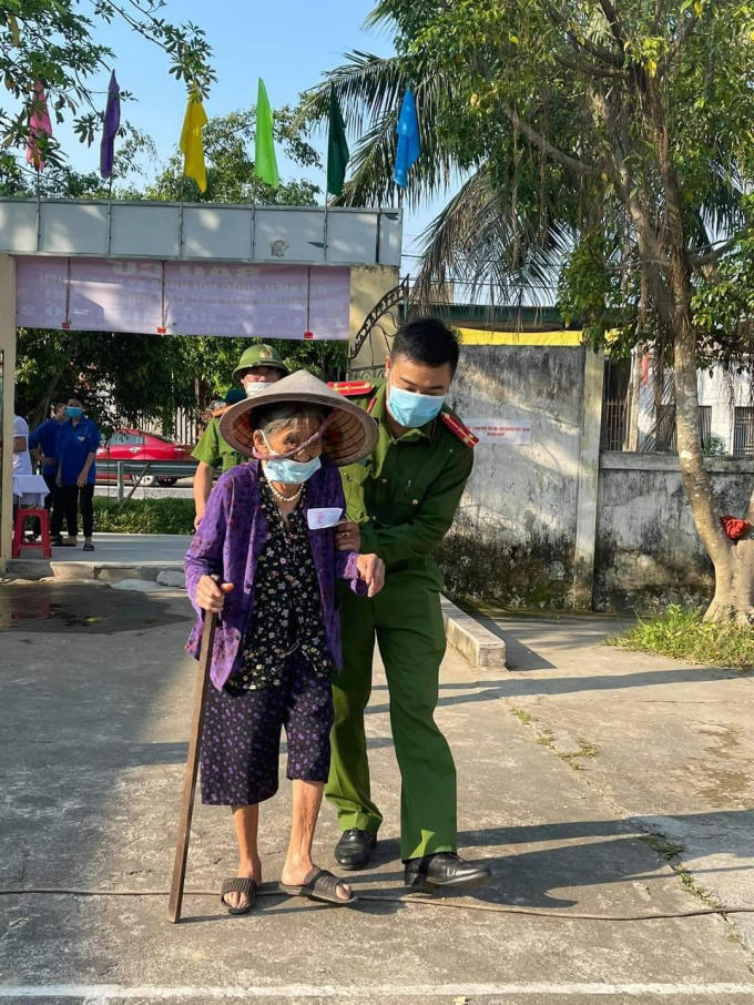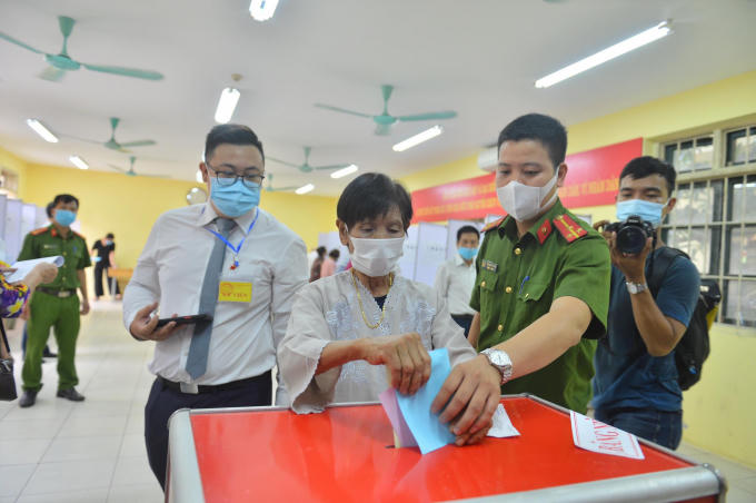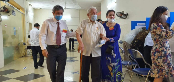 cụ bà Trần Thị Thắm (101 tuổi) dậy từ rất sớm để đến điểm bầu cử số 2 phường Phúc Xá, (quận Ba Đình, Hà Nội) để bỏ phiếu lựa chọn những người đại biểu xứng đáng, có đủ tài, đức.