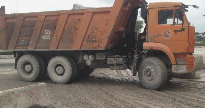 Nhiều xe ben, xe bồn chạy từ các công ty gần đó ra xa lộ Hà Nội, kéo theo hàng tấn bùn đất đổ tràn ra đường khiến giao thông khó khăn.