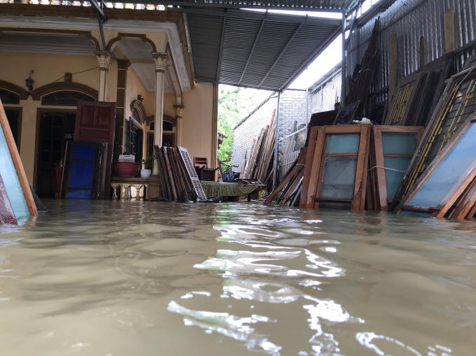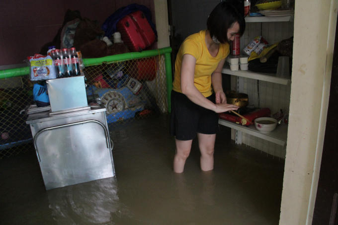 Nước vẫn bủa vây khắp nơi, đồ dùng, hàng hóa không kịp di chuyển vẫn chìm trong nước.