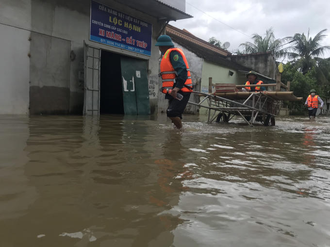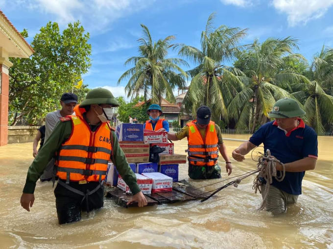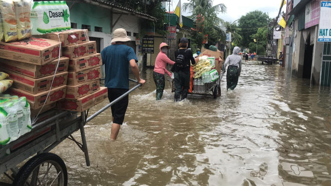 Hàng hóa thiết yếu được vận chuyển vào cho những hộ dân vùng ngập sâu tại xã Quỳnh Lâm.