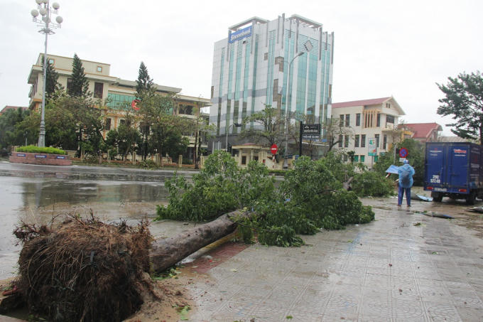 Theo ghi nhận của PV Pháp luật Plus, tại một số tuyến đường chính của TP Đồng Hới như Lý Thường Kiệt, Trần Hưng Đạo,... nhiều cây xanh cổ thụ bị quật ngã trơ gốc, nhiều cây ngã đổ đè vào nhà người dân và nhiều công trình công cộng.