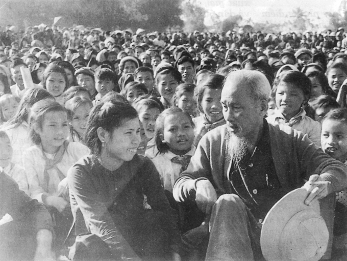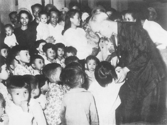 | Bác Hồ đã dành thời gian đến thăm trại trẻ, con của cán bộ miền Nam tập kết. Các cháu đón Bác, quây quần bên Bác, được Bác chia kẹo. (Ảnh tư liệu). |