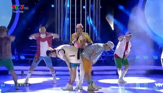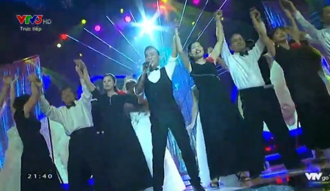 21h26: MC Đại Nghĩa xuất hiện cùng với vũ đoàn Phương Việt cùng với 3 giám khảo đêm chung kết.