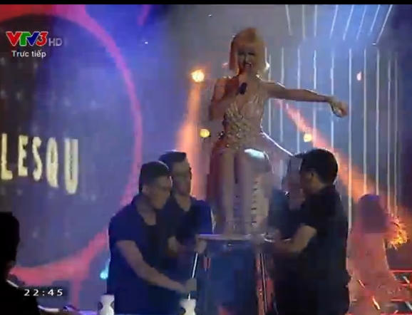 22h38: Võ Hạ Trâm thể hiện ca khúc "Show me how you Burlesque" khi hóa thân thành Christina Agullera. Lý giải về việc chọn hình tượng này, Võ Hạ Trâm cho biết bởi cô thích hình tượng này và cảm thấy mình có khả năng nhái giọng được, thân hình cũng ốm giống Christina Agullera.