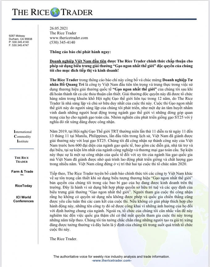Đỉnh điểm, vào cuối tháng 5/2021, TRT đã gửi thông cáo báo chí trong đó chính thức yêu cầu các doanh nghiệp kinh doanh gạo tại Việt Nam tôn trọng biểu trưng thương hiệu “Gạo ngon nhất thế giới” trên các bao bì gạo của họ đang được kinh doanh trên thị trường. Đây là hành vi vi phạm quyền sở hữu trí tuệ và các quy định của biểu trưng giài thưởng “Gạo ngon nhất thế giới”.