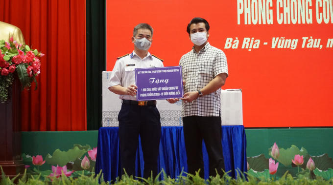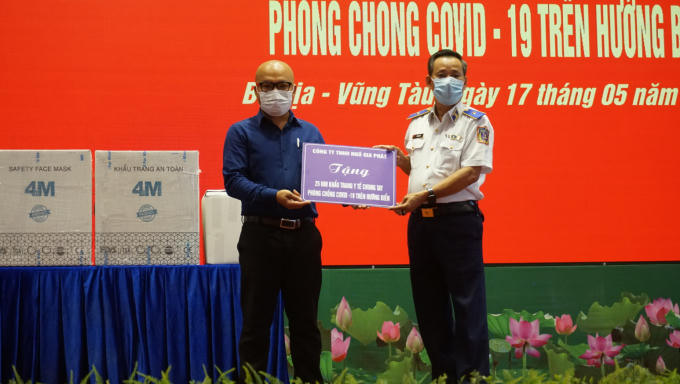 Các đơn vị ủng hộ đã trao tặng 1000 chai dung dịch rửa tay sát khuẩn cùng 25.000 khẩu trang 4M cho lực lượng Cảnh sát biển Vùng 3.