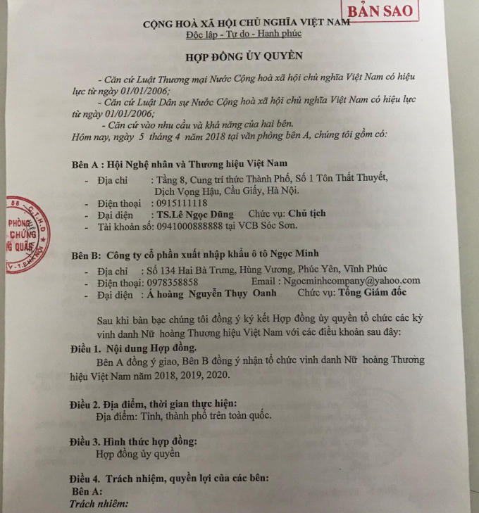 Tiếp đến, ngày 04/07/2019 sở Văn hóa và Thể Thao Hà Nội đã ban hành băn bản số 2365/SVHTT- QLNT gửi cho Công ty cổ phần xuất nhập khẩu ô tô Ngọc Minh về việc tiếp nhận thông báo tổ chức biểu diễn nghệ thuật trong chương trình “Tôn vinh Nữ hoàng Thương hiệu Việt Nam năm 2019”.
