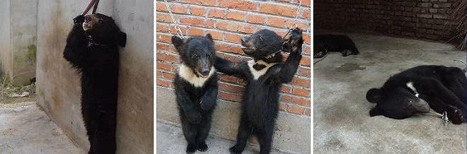 Gấu con bị buộc cổ để bắt buộc phải đứng hai chân trong quá trình dạy thú làm xiếc.