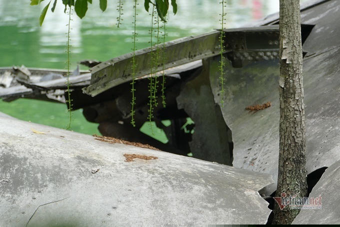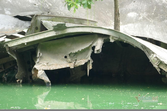 hân vỏ máy bay gần 50 năm nằm trong lòng hồ, không có dấu hiệu bị hoen gỉ. Đặc biệt, đây là chiếc máy bay B-52 bị bắn rơi tại chỗ khi chưa kịp thả bom. "Có khoảng 47 quả bom từ xác chiếc máy bay này. Nhiều quả rơi ra ngoài cắm sâu xuống lòng đất hay nằm trên đường làng. Bộ đội công binh được cử đến giúp dân tháo gỡ bom mìn, phải đến một tuần sau mới dọn sạch. Nếu những quả bom đó được thả, có lẽ tôi đã không còn sống", bà Hiển nói.