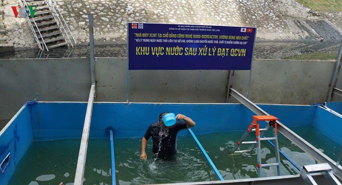 Để chứng minh việc thí điểm làm sạch đoạn sông Tô Lịch (khu vực đầu đường Hoàng Quốc Việt, Cầu Giấy - Hà Nội) bằng công nghệ Nano - Bioreactor Nhật Bản đem lại hiệu quả, nguồn nước sau xử lý đạt quy chuẩn Việt Nam, chiều 8/8, TS.Kubo Jun - Cố vấn kỹ thuật Tổ chức xúc tiến Thương mại-Môi trường Nhật Bản đã vào bể nước đạt tiêu chuẩn sau xử lý bằng công nghệ này để tắm, ngụp lặn trước sự chứng kiến của đông đảo người dân Thủ đô Hà Nội.