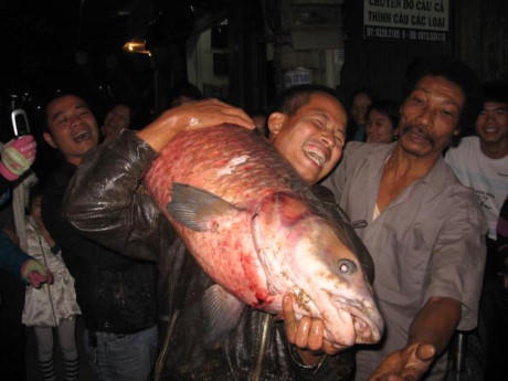 Con “quái vật” khủng nhất tóm được ở Hồ Tây vào năm 1988, là một con trắm đen lớn chưa từng có, nặng tới 90kg, tương đương một con lợn siêu nạc.