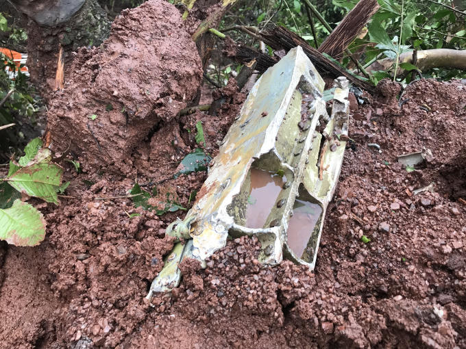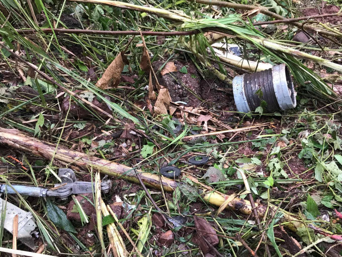 Tại hiện trường một khu vực cây cối bị gãy rạp, mùi dầu vẫn nồng nặc, nhiều mảnh vỡ rơi tại hiện trường, dù được bung ra.