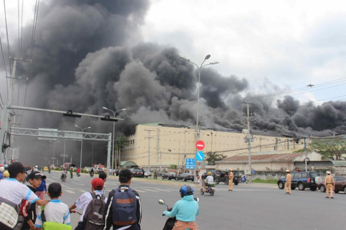 Đến khoảng 12h, các cột khói đen vẫn bốc lên ngùn ngụt, bao trùm cả tòa nhà, xa khoảng 3 km vẫn nhìn thấy.