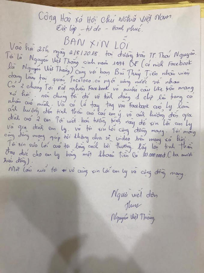 - Mình thành thật xin lỗi và mong mọi người tha thứ về những gì mình gây ra và xin mọi người đừng chia sẻ clip ngày hôm qua -Mình thật lòng xin lỗi Tocotoco Thái Nguyên".