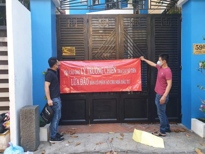 Người dân căn băng rôn yêu cầu ông Lý Trường Chiến trả tiền bán cổ phần.
