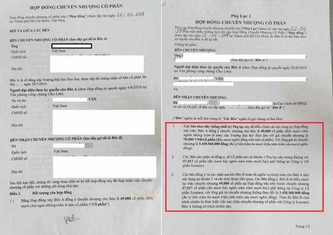 Hợp đồng chuyển nhượng cổ phần tại Trường Đại học Hoa Sen ngày 22/6/2018 và Phụ lục hợp đồng được kí cùng ngày.