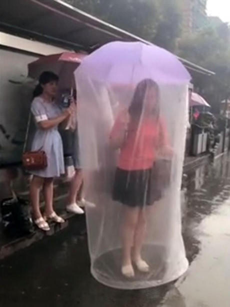 Đôi khi một chiếc ô bình thường không thể che kín người trong một trận mưa lớn. Và một cô gái trẻ ở Trung Quốc đã tìm ra giải pháp cho điều này.