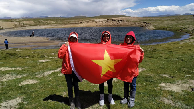 Hương Giang (ngoài cùng bên phải) cùng các bạn sinh viên Việt Nam chụp ảnh với lá cờ tổ quốc khi tham gia cuộc thi YICMG 2019 tại tỉnh Thanh Hải, Trung Quốc. Ảnh: NVCC
