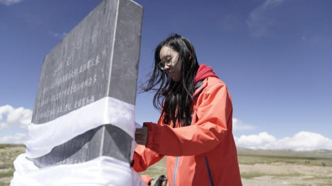 Trong chuyến đi, Hương Giang đã cùng các bạn quàng những chiếc khăn trắng đó vào tấm tấm bia đá kỷ niệm nơi thượng nguồn sông Mekong. Ảnh: NVCC
