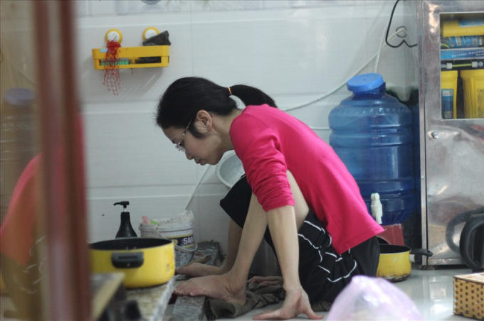 Đôi chân bị teo không thể đi được nên mọi công việc và đi lại chị Lý hoàn toàn làm bằng hai tay. Ảnh: Phạm Đông