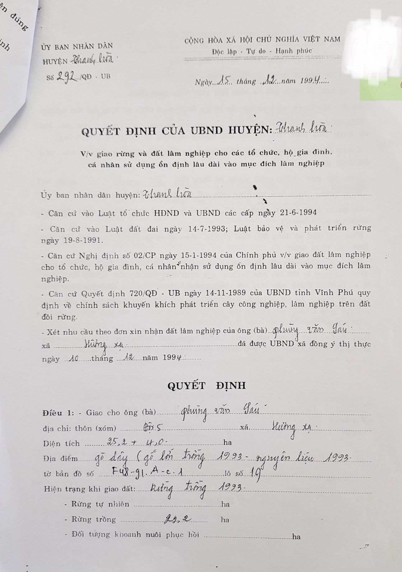 Cũng tại Biên bản và Quyết định cấp đất này trùng với Quyết định 292 ngày 15/12/1994 của UBND huyện Thanh Hòa cấp cho ông Phùng Văn Sáu 29,2ha, là lô 19. Ngoài ra ông Sáu cho rằng, không có chính sách cấp đất nào của UBND huyện thời kỳ đó. Đây là dấu hiệu của sự giả mạo hồ sơ và bản thân ông Sáu không được ký vào biên bản nhận đất nào của huyện giao mà toàn bộ là do Lâm trường Thanh Hòa cùng Ủy ban hành chính xã Hương Xạ thời đó giao theo chính sách giao đất lâm nghiệp trồng rừng… nêu trên