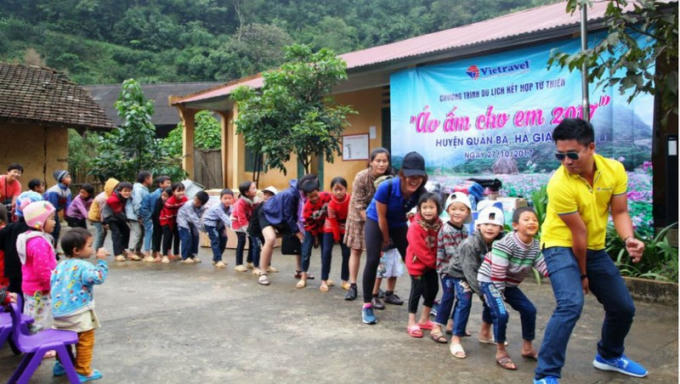 Du khách tham gia trò chơi vận động cùng các em học sinh điểm trường Tùng Pàng – Hà Giang.