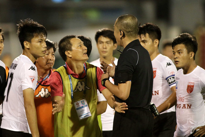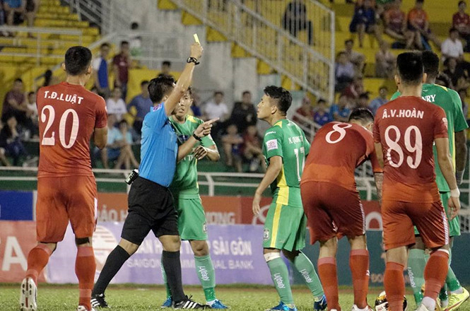 | Quyết định của trọng tài Nguyễn Trọng Thư đã gây tranh cãi trong trận T.P Hồ Chí Minh- Long An. |