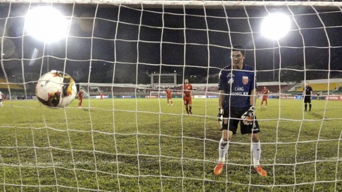 | Thủ môn Minh Nhựt quay lưng khi đối phương sút phạt đền. |