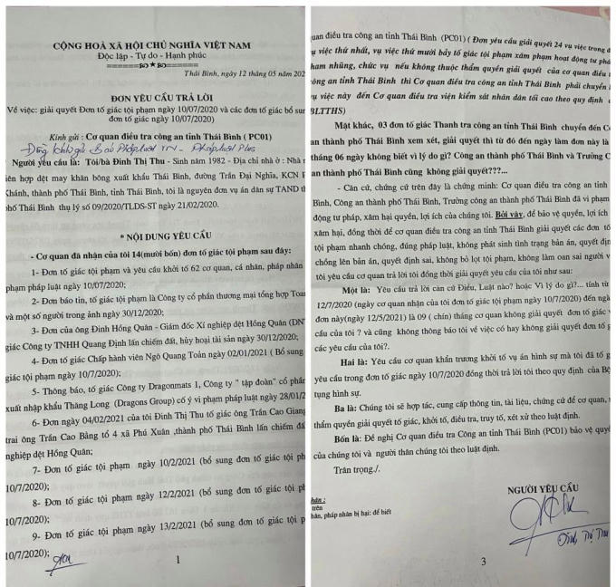 Trước đó, Pháp luật Plus đã đưa tin: “Giật mình trước lá đơn tố giác tội phạm liên quan tới nhiều cá nhân, tổ chức, xảy ra trên địa bàn tỉnh Thái Bình. Đây là nội dung đơn tố giác của bà Đinh Thị Thu (có địa chỉ tại Nhà máy Liên hợp Dệt may khăn bông xuất khẩu Thái Bình) gửi Pháp luật Plus về việc; nhiều cá nhân tổ chức đã có hành vi vi phạm như, làm sai lệch hồ sơ vụ án, không thực hiện kháng nghị của VKSND Tối cao, không thực hiện quyết định của TAND tối cao…gây thiệt hại tới tài sản hợp pháp và uy tín danh dự của bà.