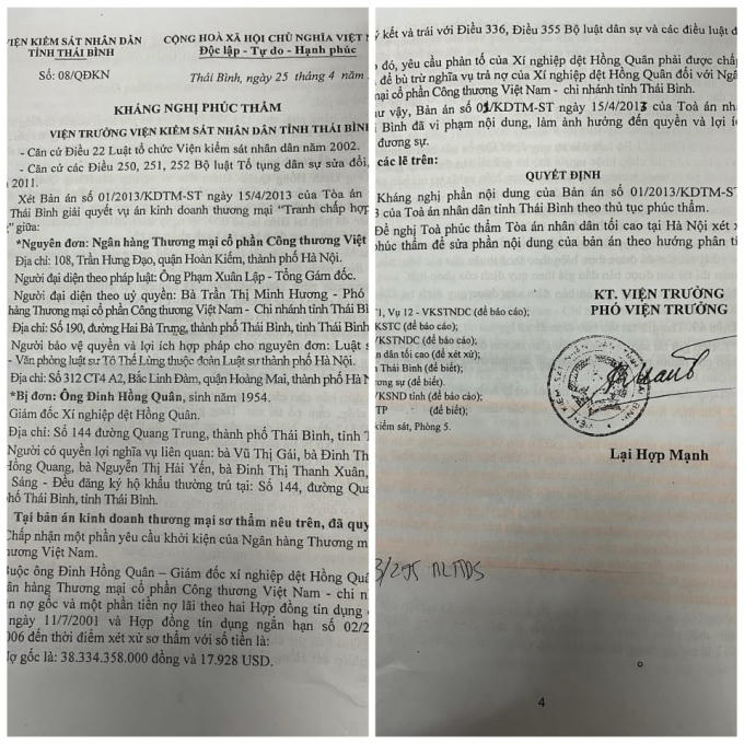 Ngày 25/4/2013, Viện trưởng VKSND tỉnh Thái Bình kháng nghị phúc thẩm số 08/QĐKN do ông Lại Hợp Mạnh – Phó Viện trưởng VKSND tỉnh Thái Bình ký; có nội dung như sau: “Tại bản án kinh doanh thương mại sơ thẩm số 01/2013/KDTM-ST, ngày 15/4/2013 của TAND tỉnh Thái Bình giải quyết vụ án kinh doanh thương mại tranh chấp hợp đồng tín dụng giữa nguyên đơn là Ngân hàng Thương mại Cổ phần Công thương Việt Nam và bị đơn là ông Đinh Hồng Quân – Giám đốc xí nghiệp Dệt Hồng Quân…