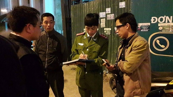 | Cơ quan công an tiến hành lập bên bản vụ việc tại công trường Eco Green City hồi đêm ngày 30/3. |