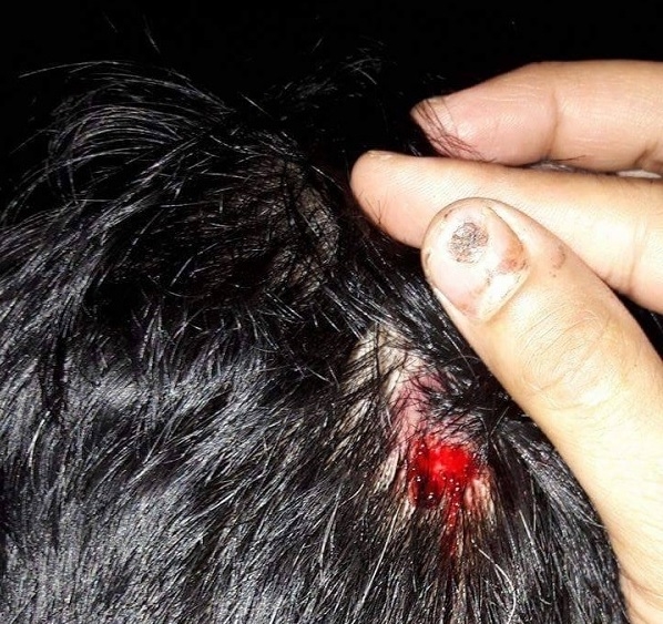 | Một công nhân khác bị hành hung chảy máu đầu. |