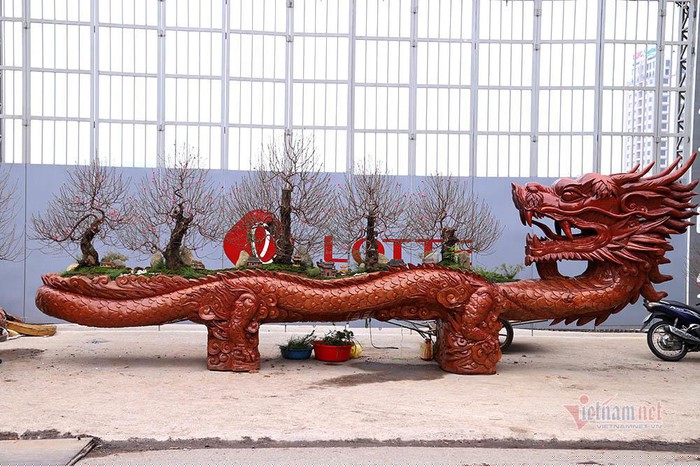 5 cây đào được chọn từ các vườn khác nhau ở làng đào Phú Thượng sao cho phù hợp nhất với chậu rồng; dưới gốc trang trí thêm nhiều tiểu cảnh. Chiếc chậu khổng lồ hình rồng làm bằng gỗ trò, xuất xứ từ Nam Phi. Chủ nhân cho biết thêm, nếu thuê chậu đào chơi tết có giá khoảng 600 triệu đồng, còn mua sẽ có giá khoảng hơn 1 tỉ đồng.