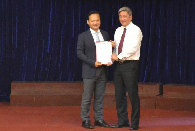 Thứ trưởng Bộ Y tế Nguyễn Trường Sơn ( Áo trắng) trao quyết định bổ nhiệm cho ông Hoàng Quốc Cường.