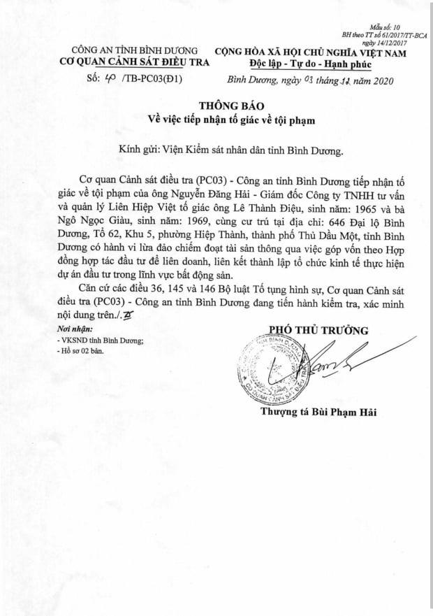 Công an tỉnh Bình Dương vừa phát đi hai thông báo cho các nạn nhân tố cáo ông Điệu lừa đảo rằng Cơ quan CSĐT (PC03) đã thực hiên phân công, thụ lý, giải quyết tố giác.