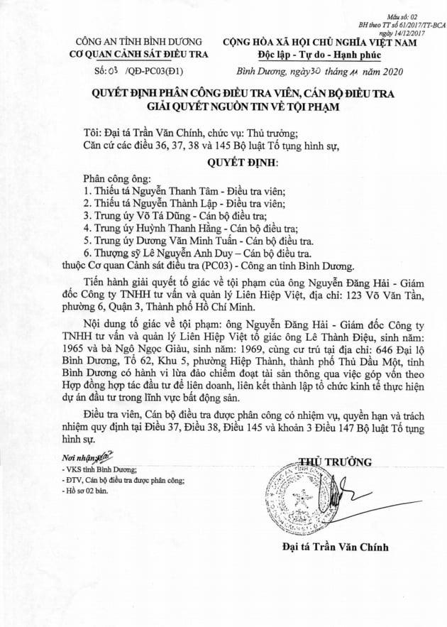 Theo Quyết định số 03/QĐ-PC03 (Đ1) của Cơ quan CSĐT về việc phân công điều tra viên, cán bộ điều tra giải quyết nguồn tin về tội phạm do Đại ta Trần Văn Chính- Thủ trưởng Cơ quan CSĐT ký cho biết, đã phân công 6 cán bộ thuộc PC03 để tiến hành giải quyết tố giác về tội phạm của ông Nguyễn Đăng Hải- Giám đốc Công ty TNHH tư vấn và quản lý Liên Hiệp Việt, địa chị 123 Võ Văn Tần, P6, Q3, TPHCM.