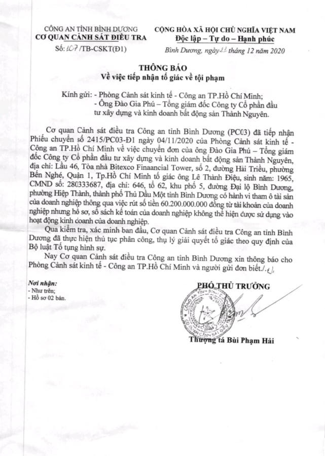 Ngoài ra, Cơ quan CSĐT cũng có thông báo số 107/TB- CSĐT (Đ1) gửi Phòng CSKT công an TPHCM và ông Đào Gia Phú – Tổng giám đốc Công ty cổ phần đầu tư xây dựng và kinh doanh bất động sản Thành Nguyên (Lầu 46, Tòa nhà Bitexco, số 2,đường Hải Triều, P Bến Nghé, Q1, TPHCM).