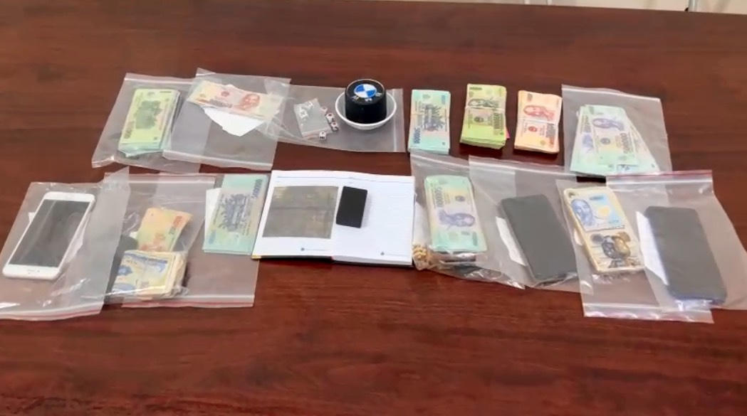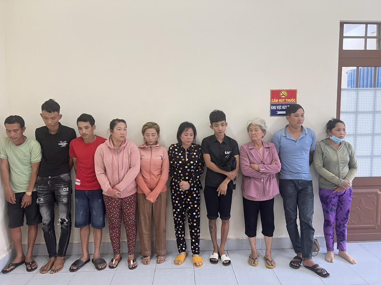 Tại hiện trường, lực lượng chức năng bắt quả tang 10 đối tượng. Thu giữ tang vật gần 130 triệu đồng, 09 hột xí ngầu, 01 bộ chén dĩa, 01 tấm manh, 09 điện thoại di động, 08 xe mô tô và nhiều đồ vật tài liệu khác có liên quan.