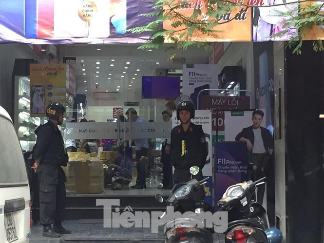 Lực lượng Cảnh sát có mặt khám xét tại cửa hàng Nhật Cường Mobile. (Ảnh: Tiền Phong)