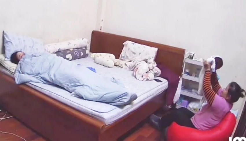 Có thời điểm, người mẹ cháu bé ngủ ngay cạnh giường nhưng bảo mẫu này vẫn có hành động nghi bạo hành cháu bé.